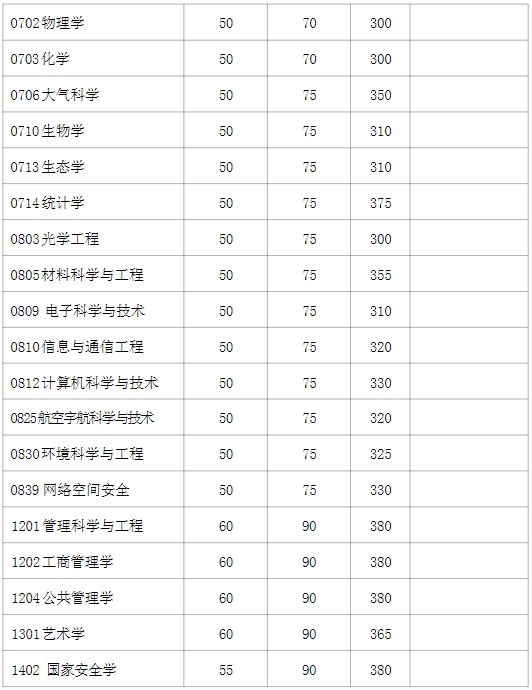 3.“退役大学生士兵计划”:总分满分等于500分的专业,要求考生单科成绩不低于所报考学科的初试成绩基本要求,总分不低于所报考院系、专业第一志愿进入复试最后一名考生总分的10分;总分满分等于300分的专业,要求考生单科成绩不低于所报考学科的初试成绩基本要求,总分不低于所报考院系、专业第一志愿进入复试最后一名考生总分的5分。